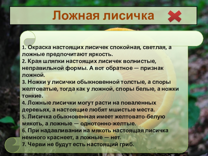4. Ложные лисички могут расти на поваленных деревьях, а настоящие любят мшистые места.