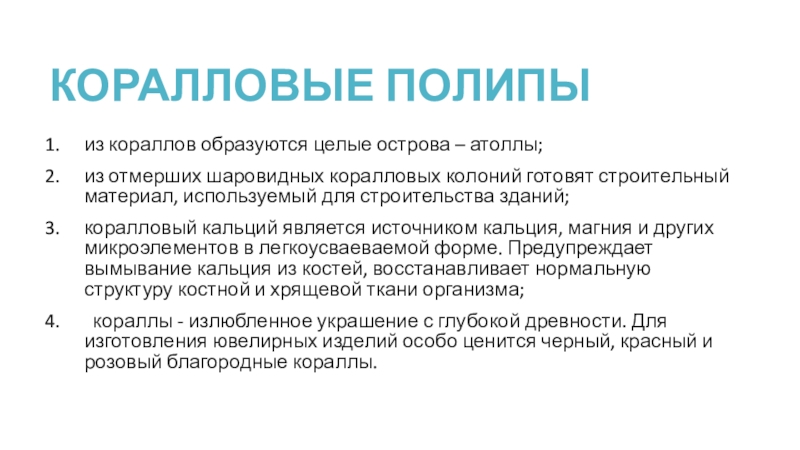 КОРАЛЛОВЫЕ ПОЛИПЫиз кораллов образуются целые острова – атоллы; из отмерших шаровидных коралловых колоний готовят строительный материал, используемый