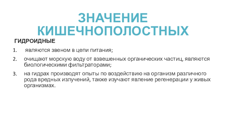 ЗНАЧЕНИЕ КИШЕЧНОПОЛОСТНЫХГИДРОИДНЫЕ являются звеном в цепи питания; очищают морскую воду от взвешенных органических частиц, являются биологическими фильтраторами;