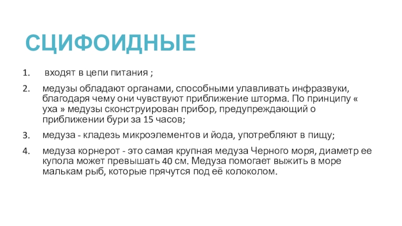 СЦИФОИДНЫЕ входят в цепи питания ;медузы обладают органами, способными улавливать инфразвуки, благодаря чему они чувствуют приближение шторма.