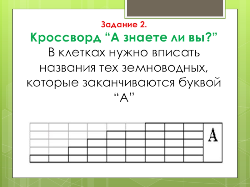 Задание 2.  Кроссворд “А знаете ли вы?”  В клетках нужно вписать названия тех земноводных, которые