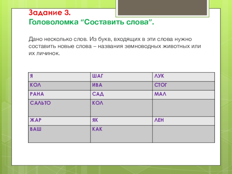 Задание 3.  Головоломка “Составить слова”.   Дано несколько слов. Из букв, входящих в эти слова