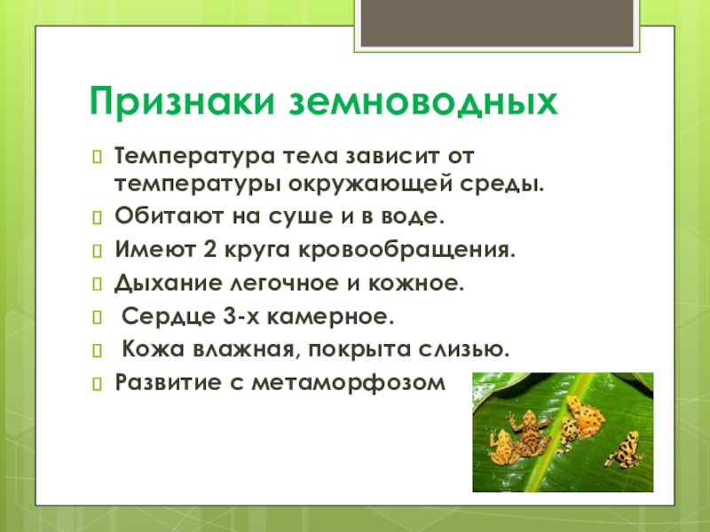 Признаки земноводныхТемпература тела зависит от температуры окружающей среды.Обитают на суше и в воде.Имеют 2 круга кровообращения.Дыхание легочное