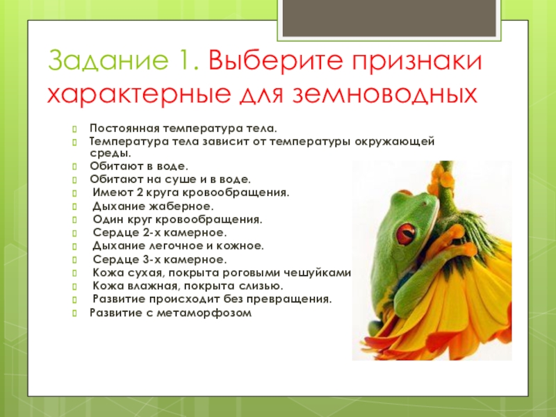 Слайд 3Задание 1. Выберите признаки характерные для земноводных