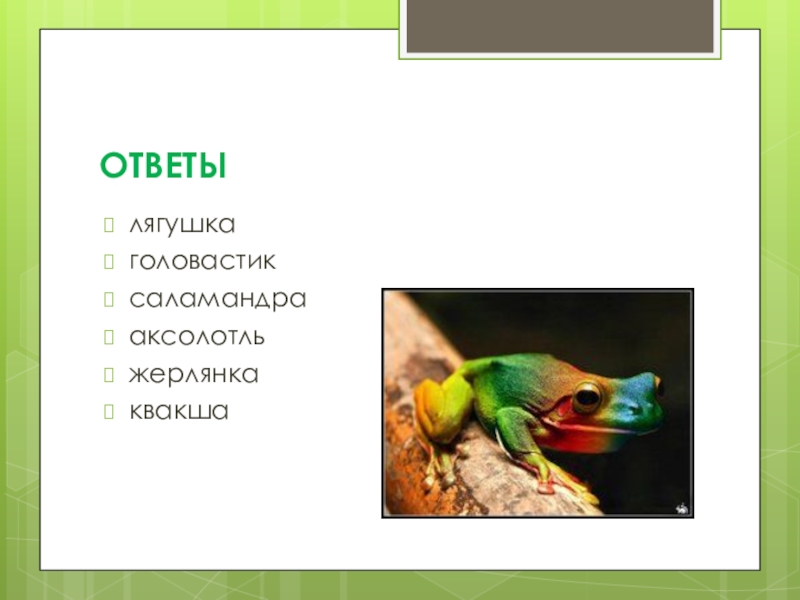 ОТВЕТЫлягушкаголовастиксаламандрааксолотльжерлянкаквакша