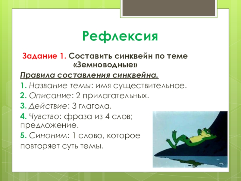 РефлексияЗадание 1. Составить синквейн по теме «Земноводные»Правила составления синквейна. 1. Название темы: имя существительное.2. Описание: 2 прилагательных.3.