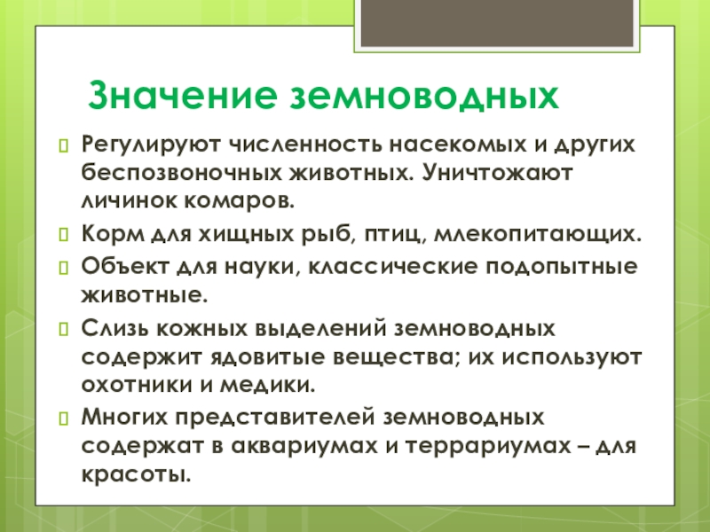 Значение земноводныхРегулируют численность насекомых и других беспозвоночных животных. Уничтожают личинок комаров.Корм для хищных рыб, птиц, млекопитающих.Объект для