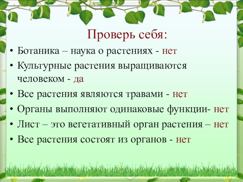 Проверь себя:Ботаника – наука о растениях - нетКультурные растения выращиваются человеком - да Все растения являются