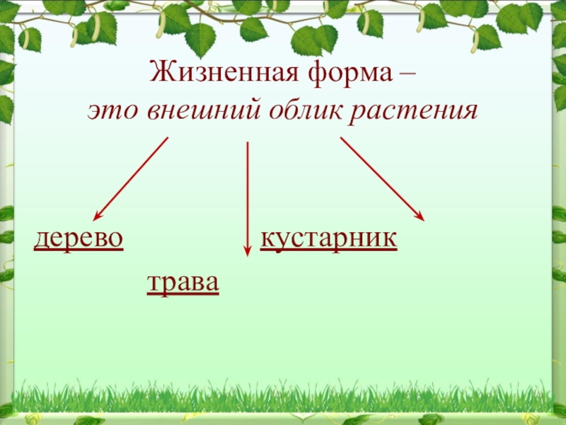 Жизненная форма –  это внешний облик растения дерево					кустарник				трава