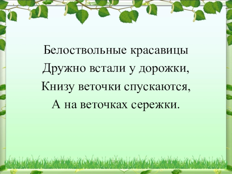 Белоствольные красавицыДружно встали у дорожки,Книзу веточки спускаются,А на веточках сережки.