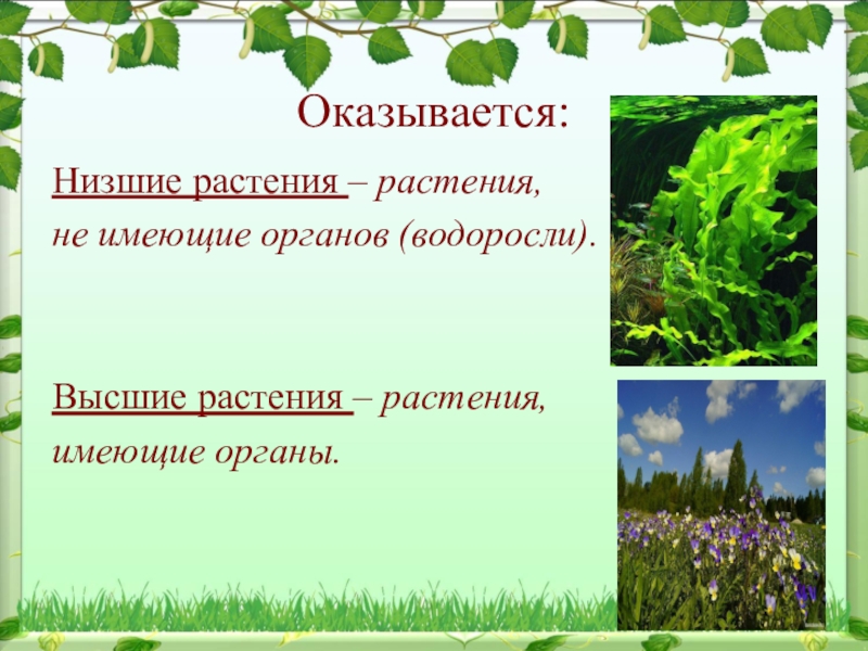 Оказывается:Низшие растения – растения, не имеющие органов (водоросли).Высшие растения – растения,имеющие органы.