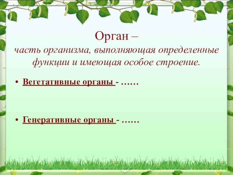 Орган –  часть организма, выполняющая определенные функции и имеющая особое строение. Вегетативные органы -
