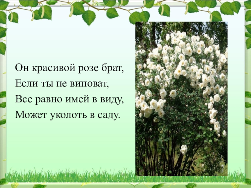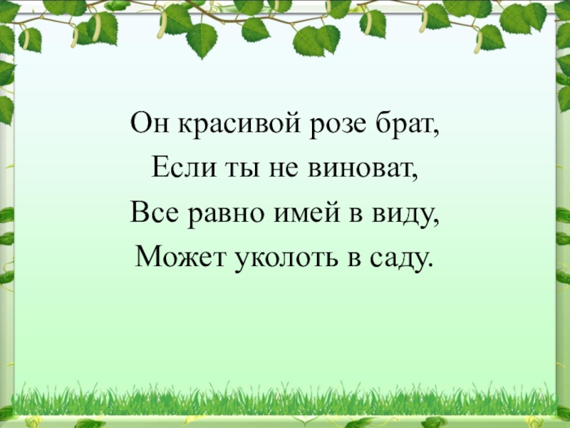 Он красивой розе брат,Если ты не виноват,Все равно имей в виду,Может уколоть в саду.