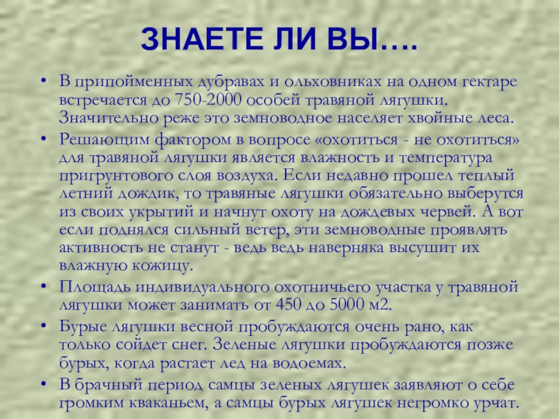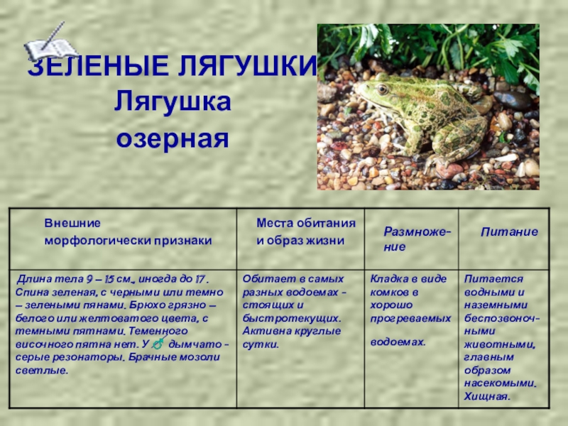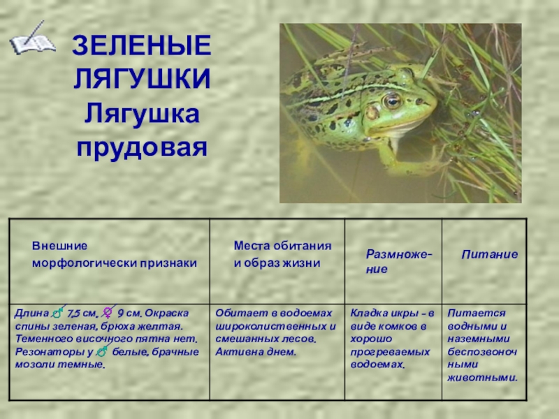 В брачный период самцы зеленых лягушек заявляют о себе громким кваканьем, а самцы бурых лягушек негромко урчат.