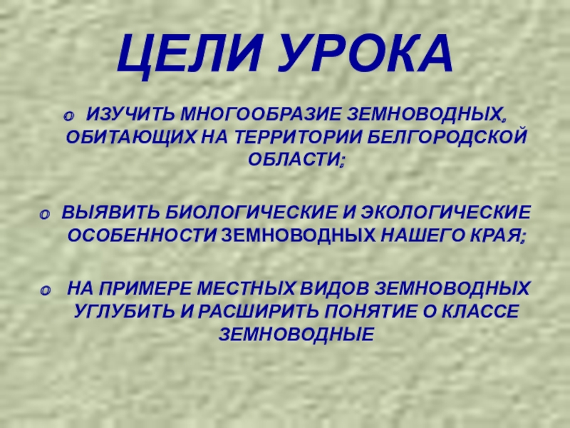 ИЗУЧИТЬ МНОГООБРАЗИЕ ЗЕМНОВОДНЫХ, ОБИТАЮЩИХ НА ТЕРРИТОРИИ БЕЛГОРОДСКОЙ ОБЛАСТИ;