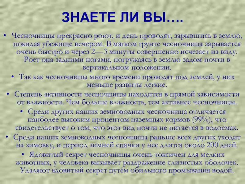 покидая убежище вечером. В мягком грунте чесночница зарывается очень быстро и через 2—3 минуты совершенно исчезает из виду. Роет она задними ногами, погружаясь в землю задом почти в вертикальном положении.