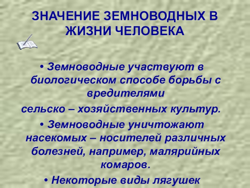 Слайд 34ЗНАЧЕНИЕ ЗЕМНОВОДНЫХ В ЖИЗНИ ЧЕЛОВЕКА