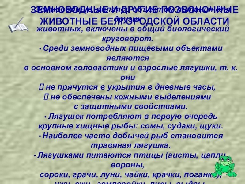 Слайд 4Биологические и экологические особенности земноводных Белгородской области