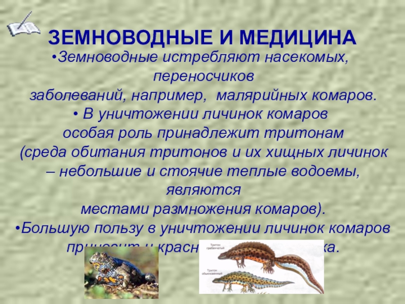Земноводные уничтожают насекомых – носителей различных болезней, например, малярийных комаров.