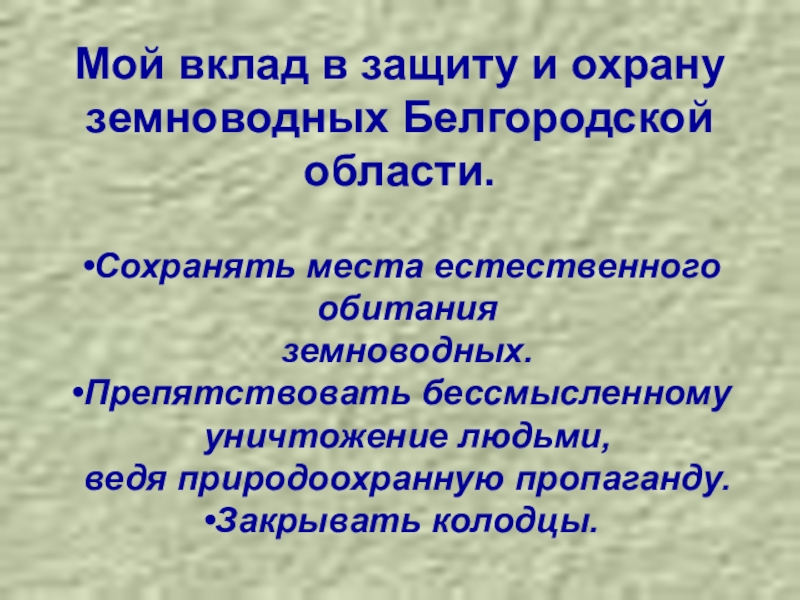 Слайд 41Мой вклад в защиту и охрану земноводных Белгородской области.
