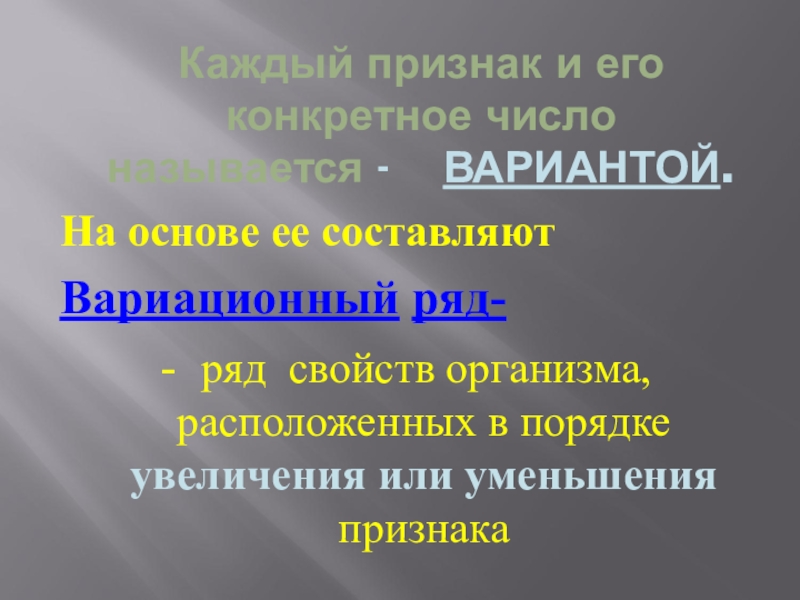 Слайд 14Каждый признак и его конкретное число называется - ВАРИАНТОЙ.