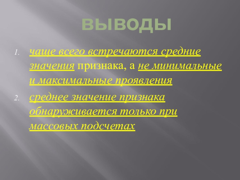 чаще всего встречаются средние значения признака, а не минимальные и максимальные