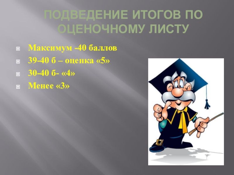 Слайд 23ПОДВЕДЕНИЕ ИТОГОВ ПО ОЦЕНОЧНОМУ ЛИСТУ