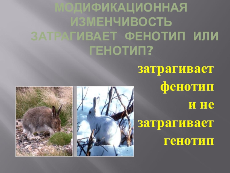 Слайд 6МОДИФИКАЦИОННАЯ ИЗМЕНЧИВОСТЬ ЗАТРАГИВАЕТ ФЕНОТИП ИЛИ ГЕНОТИП?