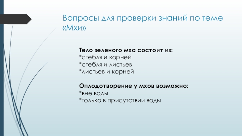 Вопросы для проверки знаний по теме «Мхи»Тело зеленого мха состоит из:*стебля и корней *стебля и листьев*листьев и