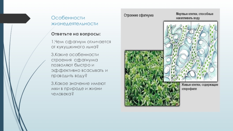 Особенности жизнедеятельностиОтветьте на вопросы:1.Чем сфагнум отличается от кукушкиного льна?3.Какие особенности строения сфагнума позволяют быстро и эффективно всасывать