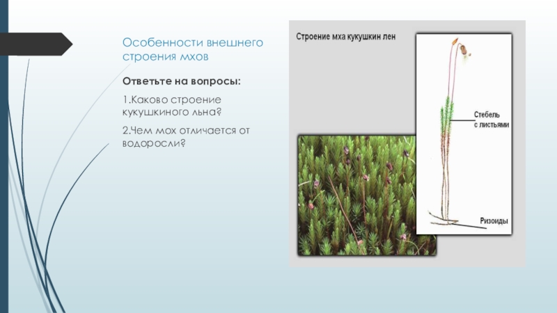 Особенности внешнего строения мховОтветьте на вопросы:1.Каково строение кукушкиного льна?2.Чем мох отличается от водоросли?