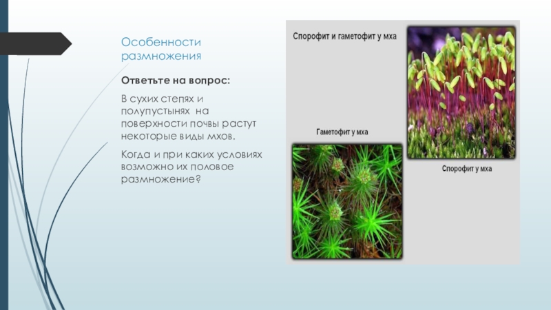 Особенности размноженияОтветьте на вопрос:В сухих степях и полупустынях на поверхности почвы растут некоторые виды мхов.Когда и при