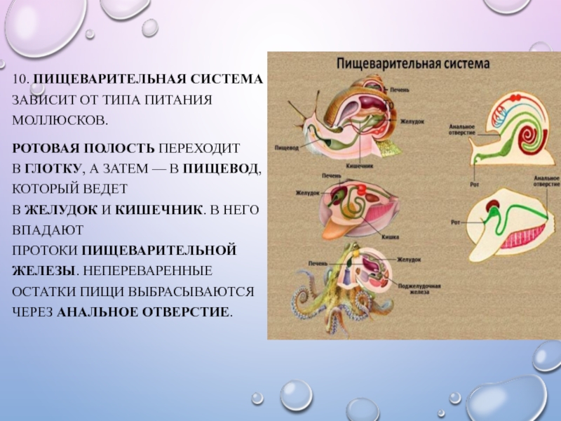 10. ПИЩЕВАРИТЕЛЬНАЯ СИСТЕМА ЗАВИСИТ ОТ ТИПА ПИТАНИЯ МОЛЛЮСКОВ.РОТОВАЯ ПОЛОСТЬ ПЕРЕХОДИТ В ГЛОТКУ, А ЗАТЕМ — В ПИЩЕВОД, КОТОРЫЙ ВЕДЕТ В ЖЕЛУДОК И КИШЕЧНИК.