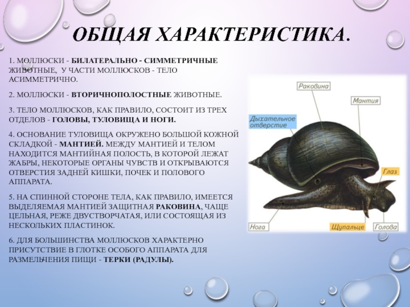 ОБЩАЯ ХАРАКТЕРИСТИКА.1. МОЛЛЮСКИ - БИЛАТЕРАЛЬНО - СИММЕТРИЧНЫЕ ЖИВОТНЫЕ, У ЧАСТИ МОЛЛЮСКОВ - ТЕЛО АСИММЕТРИЧНО.2. МОЛЛЮСКИ - ВТОРИЧНОПОЛОСТНЫЕ