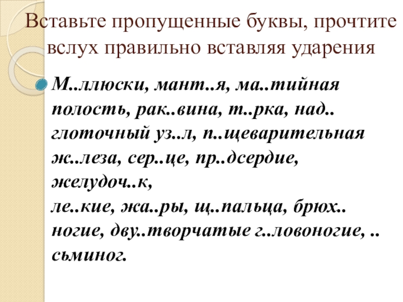 Слайд 4Вставьте пропущенные буквы, прочтите вслух правильно вставляя ударения