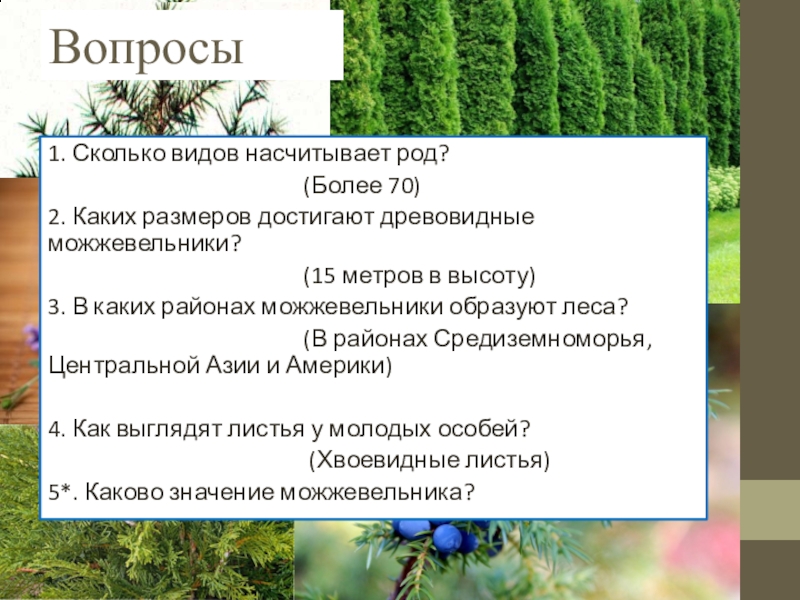 Древовидные можжевельники, достигающие крупных размеров (до 15 м высоты), образуют светлые леса в засушливых районах Средиземноморья, Центральной Азии и Америки. Только немногие виды, такие, например, как можжевельник обыкновенный, имеют широкие ареалы.