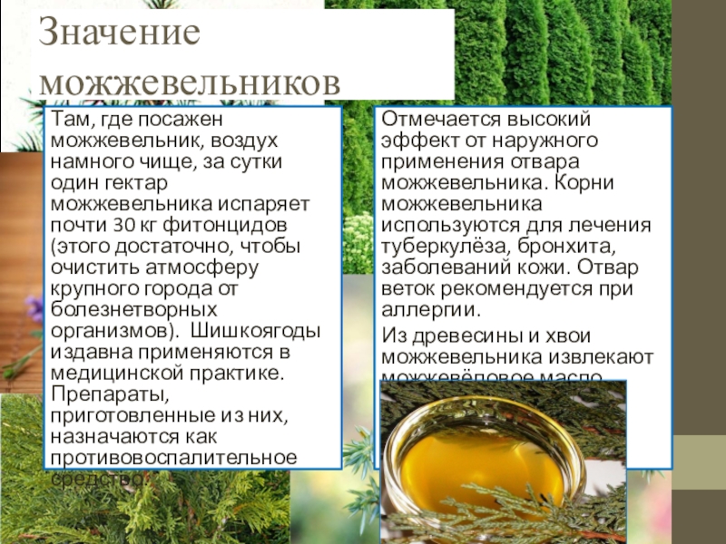 Из древесины и хвои можжевельника извлекают можжевёловое масло.