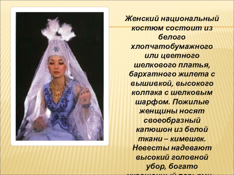бархатного жилета с вышивкой, высокого колпака с шелковым шарфом. Пожилые женщины носят своеобразный капюшон из белой ткани – кимешек. Невесты надевают высокий головной убор, богато украшенный перьями – саукеле