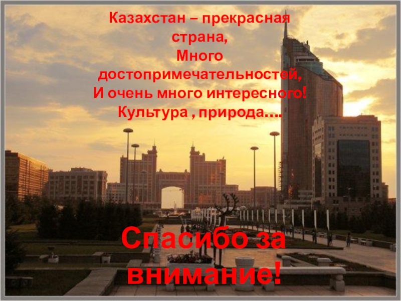 Казахстан – прекрасная страна,Много достопримечательностей,И очень много интересного!Культура , природа….Спасибо за внимание!
