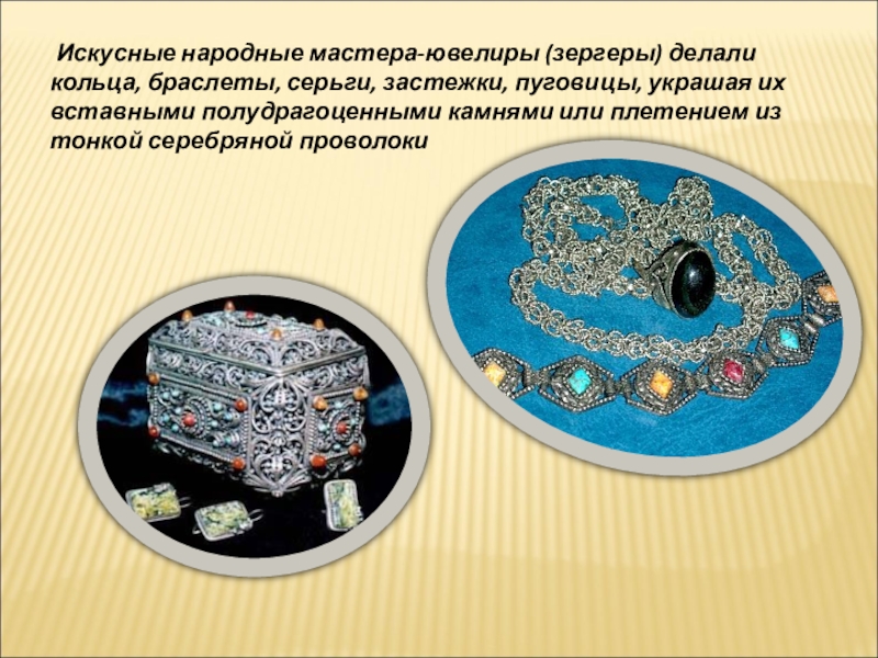 Слайд 17 Искусные народные мастера-ювелиры (зергеры) делали кольца, браслеты, серьги, застежки, пуговицы,