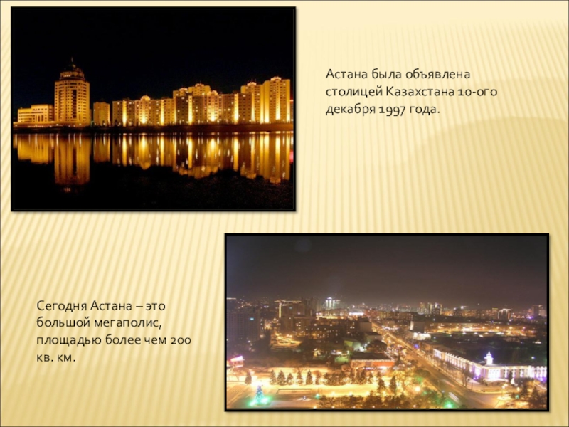 Астана была объявлена столицей Казахстана 10-ого декабря 1997 года.Сегодня Астана – это большой мегаполис, площадью более чем