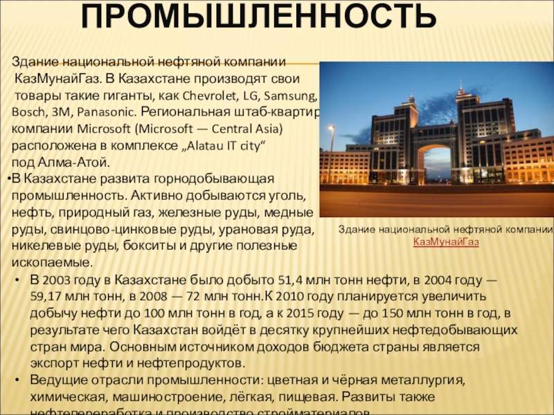 ПРОМЫШЛЕННОСТЬЗдание национальной нефтяной компании КазМунайГаз. В Казахстане производят свои товары такие гиганты, как Chevrolet, LG, Samsung, Bosch,