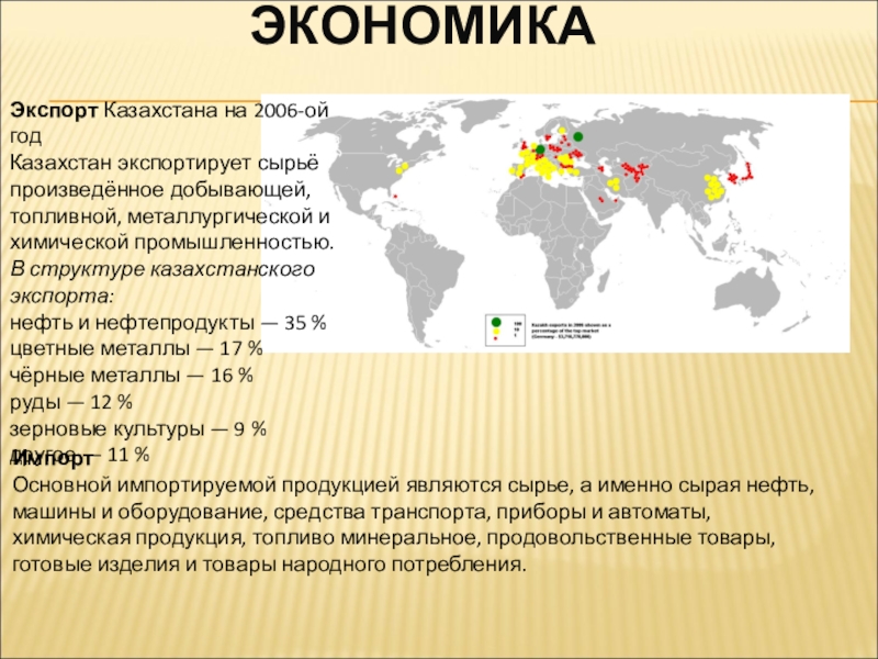 Экспорт Казахстана на 2006-ой годКазахстан экспортирует сырьё произведённое добывающей, топливной, металлургической и химической промышленностью.В структуре казахстанского экспорта:нефть
