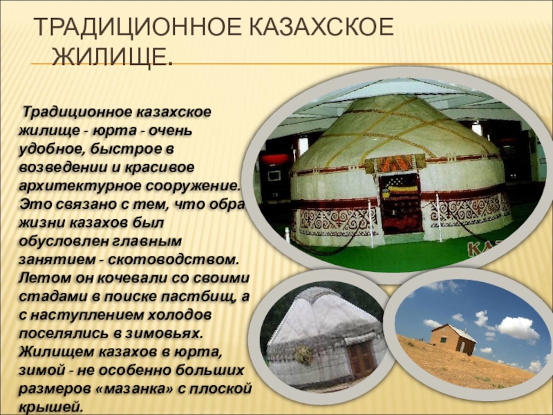 быстрое в возведении и красивое архитектурное сооружение. Это связано с тем, что образ жизни казахов был обусловлен главным занятием - скотоводством. Летом он кочевали со своими стадами в поиске пастбищ, а с наступлением холодов поселялись в зимовьях. Жилищем казахов в юрта, зимой - не особенно больших размеров «мазанка» с плоской крышей.