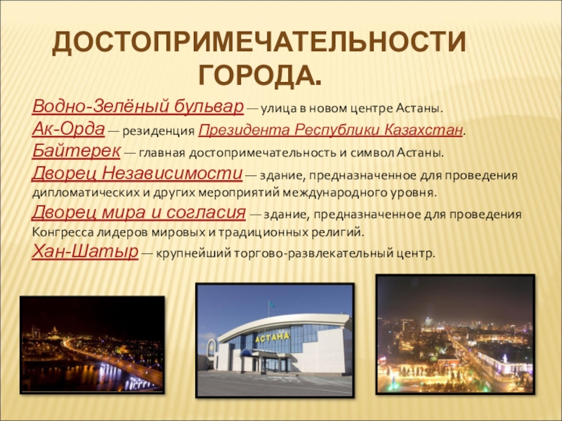 ДОСТОПРИМЕЧАТЕЛЬНОСТИ  ГОРОДА.Водно-Зелёный бульвар — улица в новом центре Астаны.Ак-Орда — резиденция Президента Республики Казахстан.Байтерек — главная достопримечательность и символ Астаны.Дворец