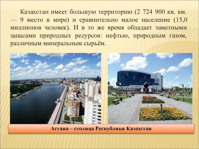 Казахстан имеет большую территорию (2 724 900 кв. км. — 9 место в мире) и сравнительно малое