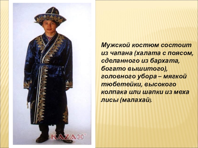 Слайд 19Мужской костюм состоит из чапана (халата с поясом, сделанного из бархата,