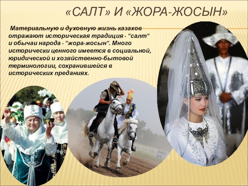 Материальную и духовную жизнь казахов отражают историческая традиция - "салт" и обычаи народа - "жора-жосын". Много исторически ценного имеется в социальной, юридической и хозяйственно-бытовой терминологии, сохранившейся в исторических преданиях.