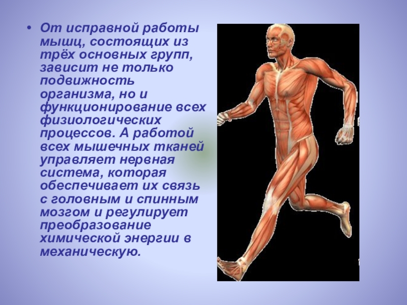 Слайд 4От исправной работы мышц, состоящих из трёх основных групп, зависит не
