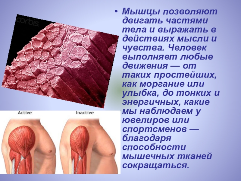 Слайд 3Мышцы позволяют двигать частями тела и выражать в действиях мысли и